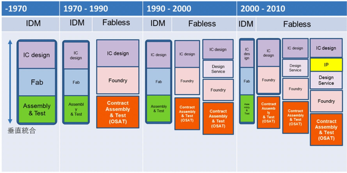 也就是说,从前半导体企业会在公司内部完成从电路设计到测试、品质检测的所有环节,而如今不仅晶圆制造、封装组装等环节被外包,甚至连设计也委托外部企业进行的情况也越来越多。