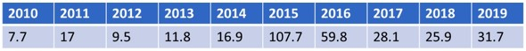另一项重要影响因素是所谓的“行业重组”,即半导体企业间的并购与整合。以下表格显示了2010年至2019年期间,每年发生的半导体企业并购金额(单位:10亿美元)