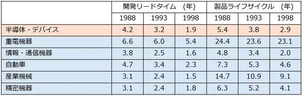 这里引用一份资料。这份资料是由日本“经济团体联合会”(经团联)在1998年编制的《强化产业技术实力现状调查报告》(産業技術力強化のための実態調査)。在这份报告中,针对企业加强技术实力的举措,调查了各个业务领域的开发周期与产品生命周期的关系。虽然这份资料距今已有20多年,但其中反映的趋势至今仍未发生根本性变化,因此我们可以参考其中的一部分数据。
